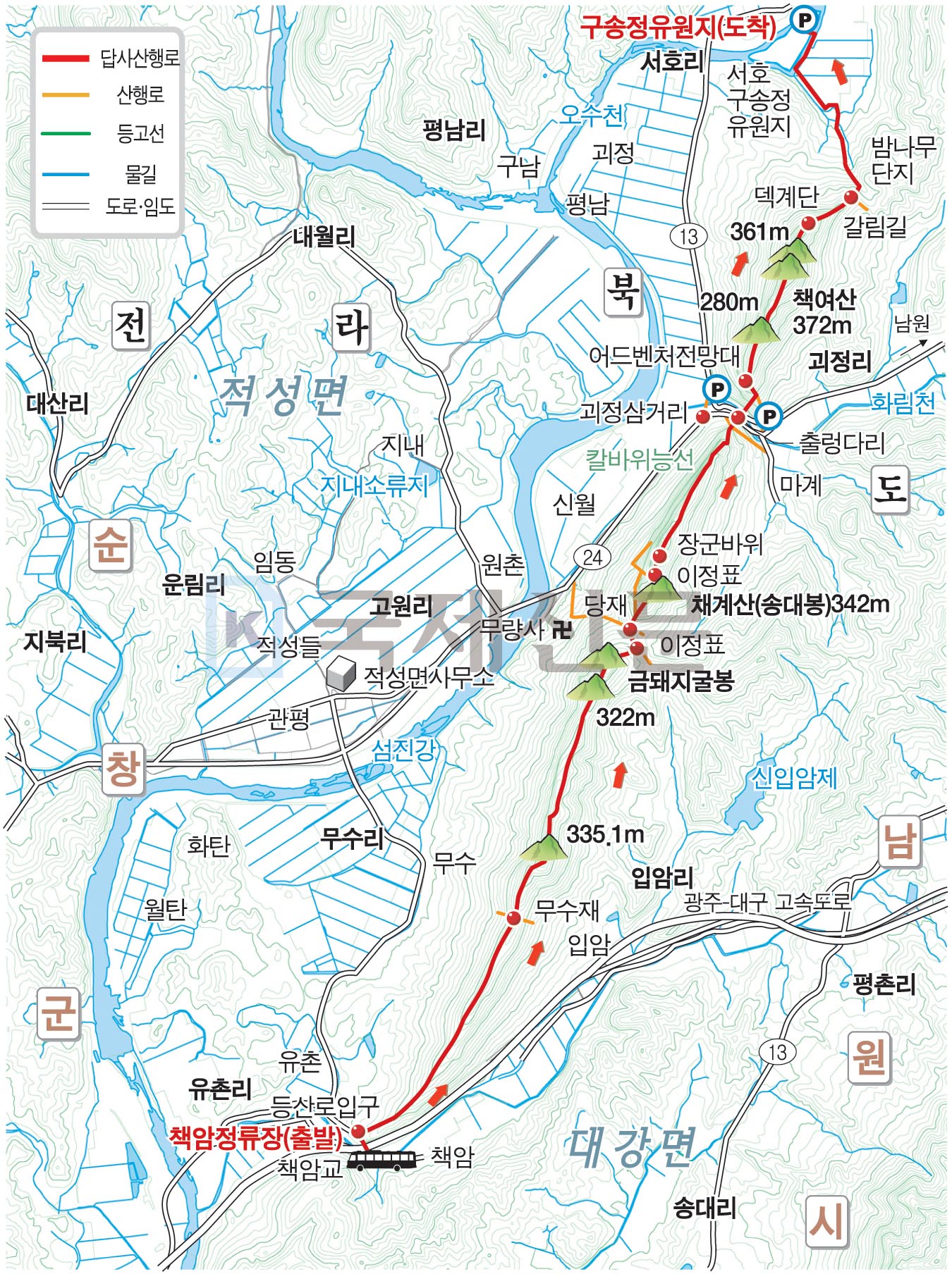 - 책암 정류장 출발 약 8.4㎞ 코스 - 산행 초반 소나무 오솔길선 힐링 - 360도 파노라마 송대봉 조망 - 적성들 적시는 섬진강 풍경 황홀 - 최..