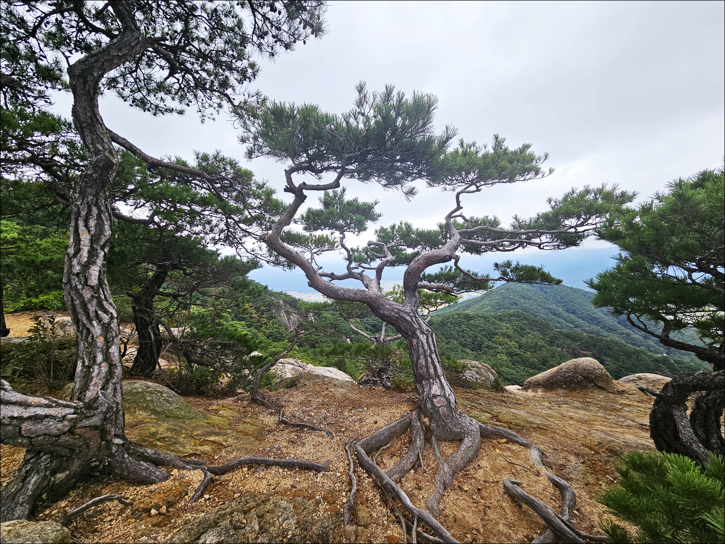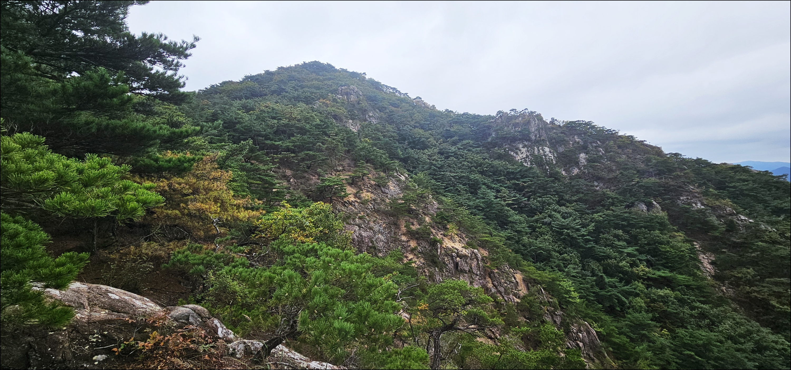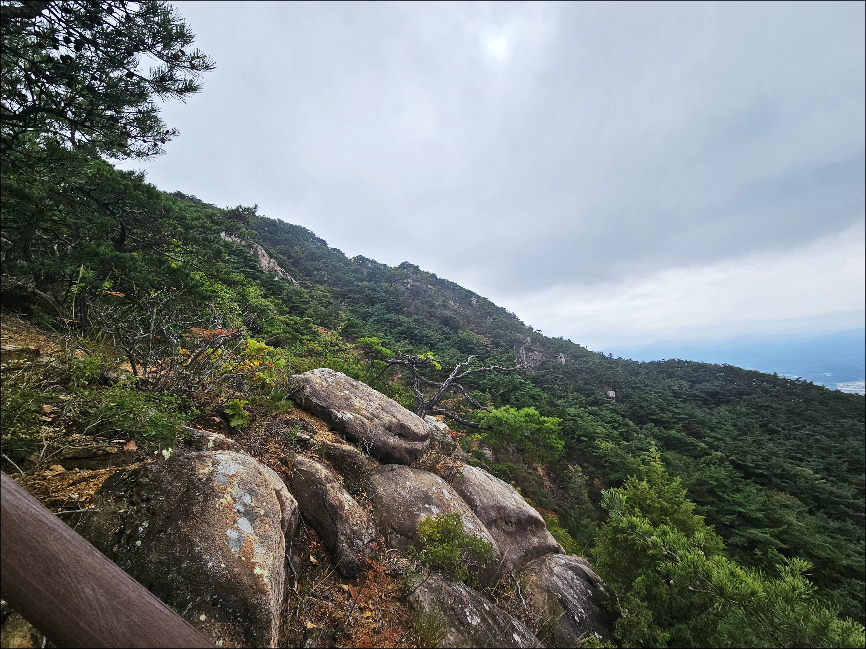 이무기능선 하산시 이슬비로 미끄러움과 무릎통증으로 하산시간 늘어남